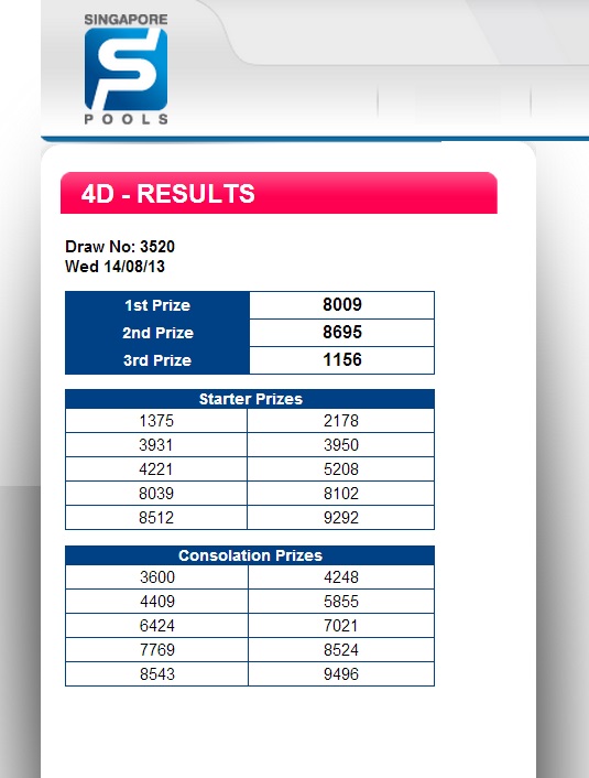 Live 4D Results for Magnum 4D, Sports ToTo, DaMaCai 1+3D, Sabah 4D, CashSweep 4D, Sandakan 4D & Singapore 4D. 4D Result 4D Msia West Msia East Msia Singapore GD Lotto You can check Singapore 4D live results at 4DSG official website. Third - Singapore Sweep. Draw results are announced once a month (Wednesdays specifically, and at 6:30 pm). To join, you much select 7 numbers (starting 0 to 9). Minimum bets are $2. If your pick can match all 7 announced numbers in order, you get the jackpot.